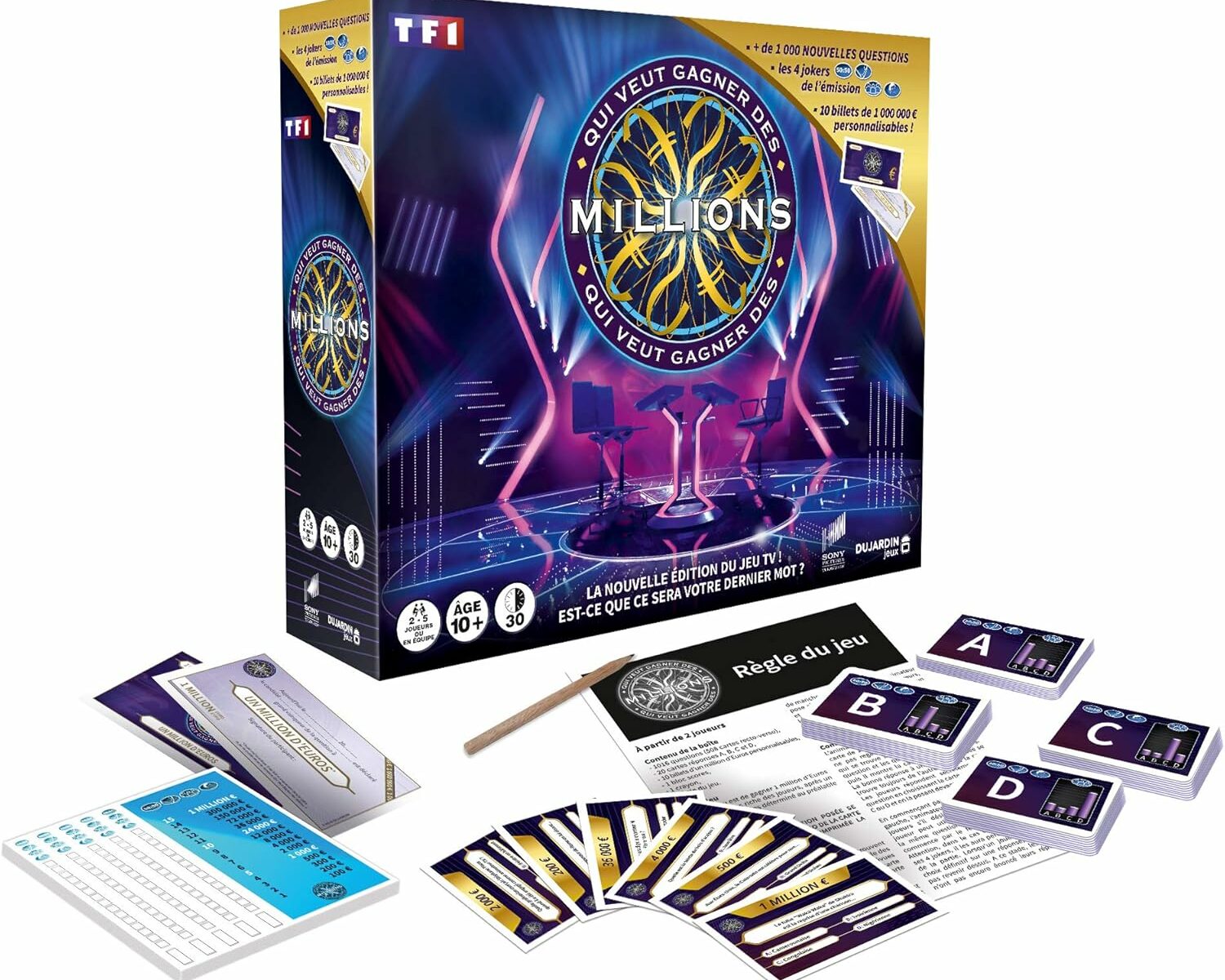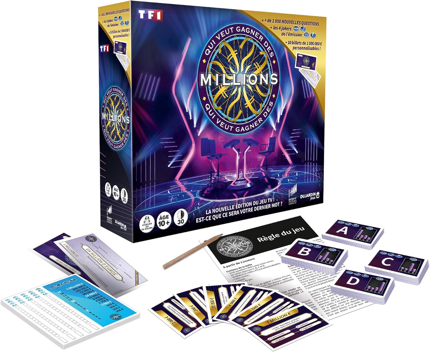 Contient: 1016 questions, 10 billets/chèques personnalisables d’1 000 000 d’euros, 20 cartes réponses a, B, C, D, 1 crayon, 1 bloc score, 1 règle du jeu